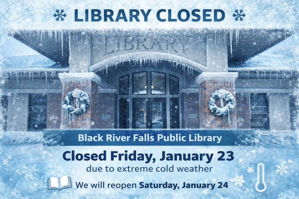 The Black River Falls Public Library will be closed on Friday, January 23rd and reopen on Saturday, January 24th.