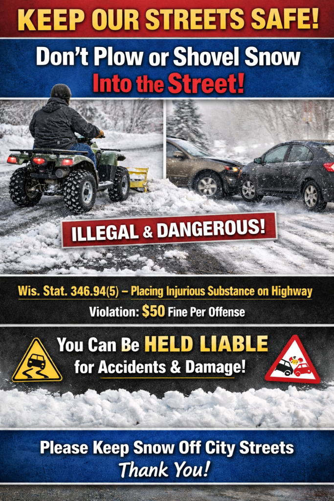 Please help us keep our City streets and highways safe; do not deposit any snow/ice from your driveway onto any City street or highway.